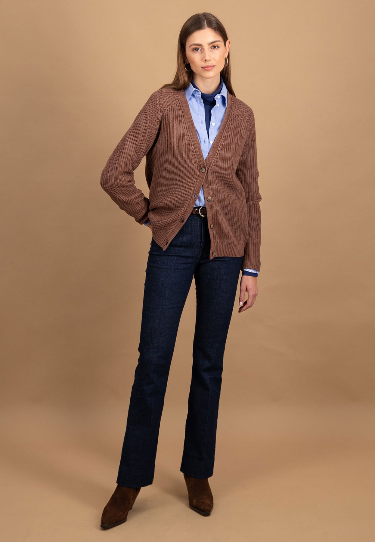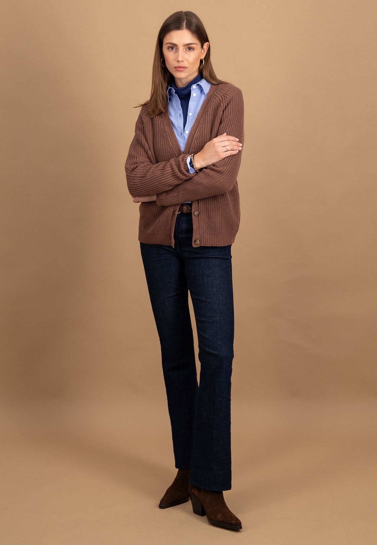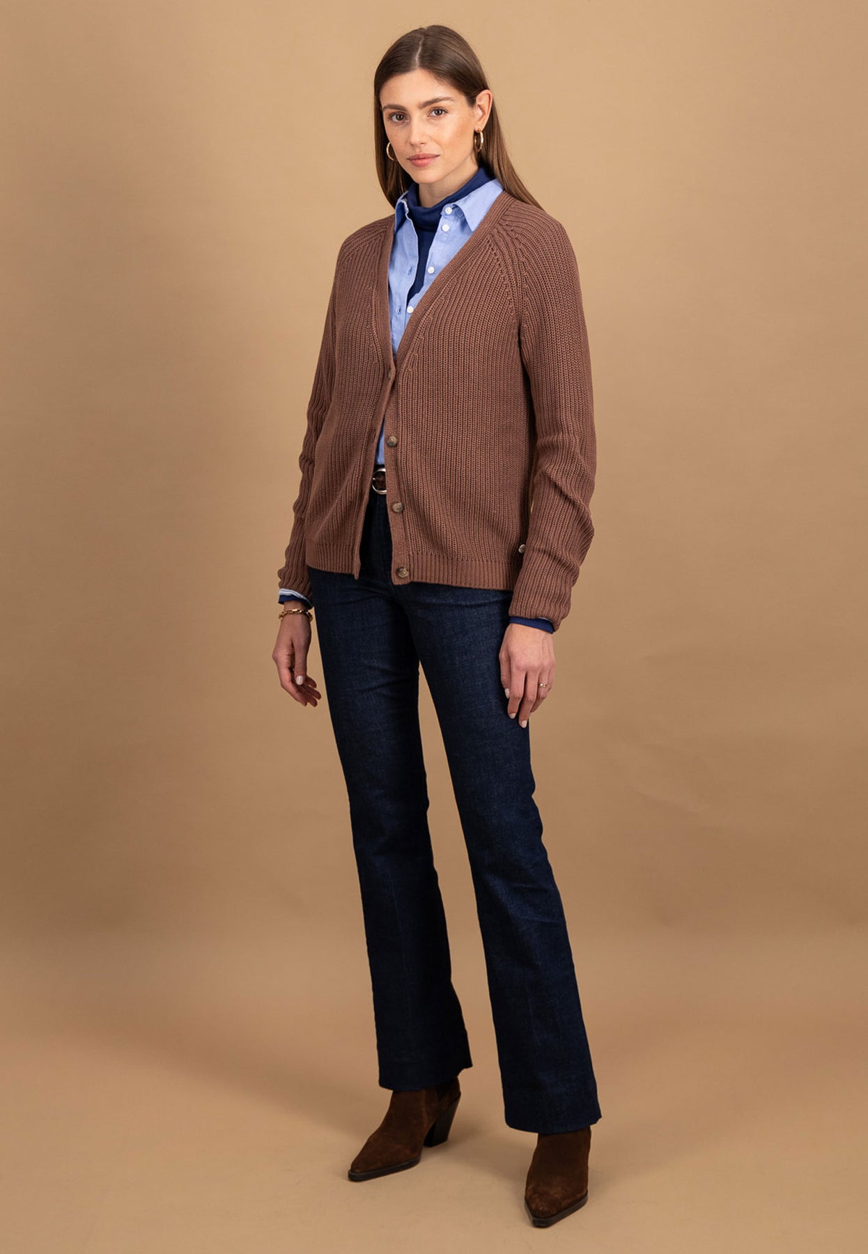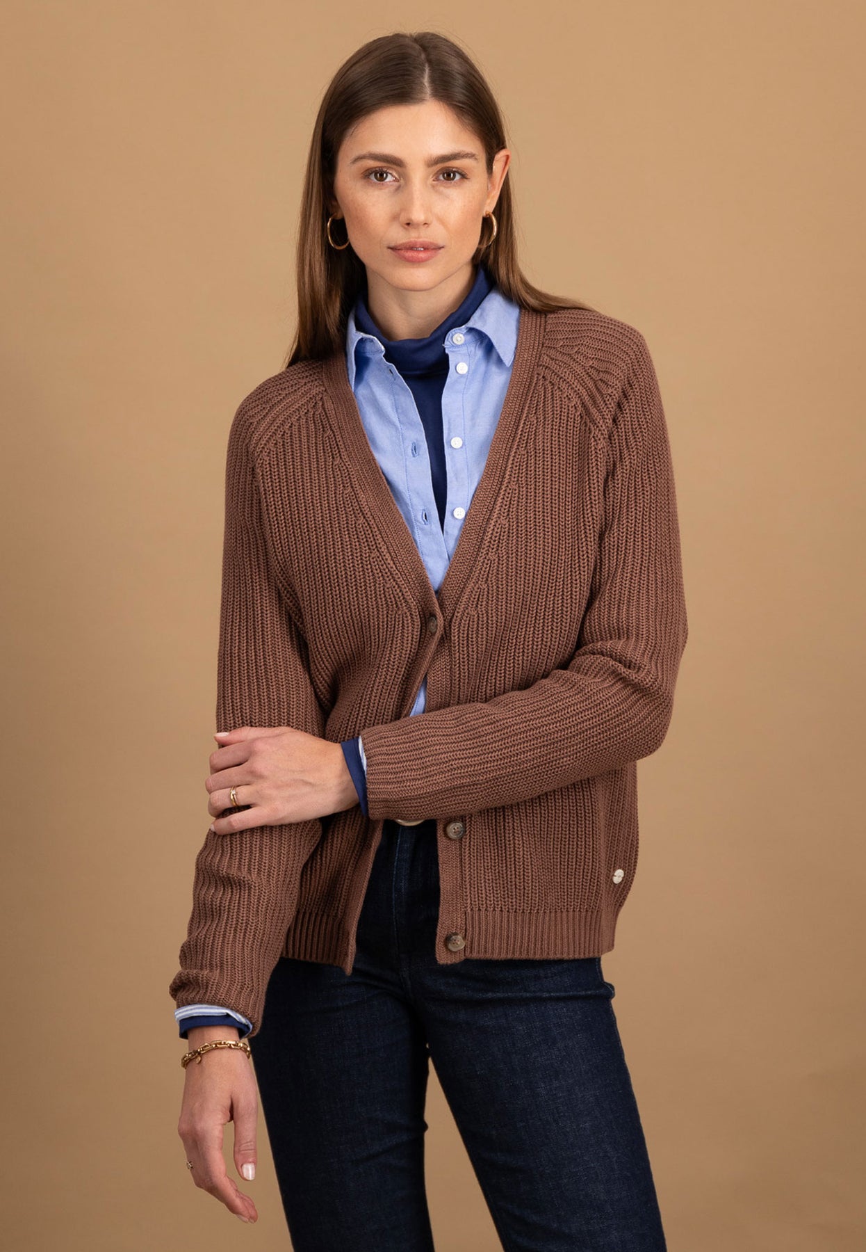 Die grobe Rippenstruktur und der tiefe V-Ausschnitt verleihen dieser Strickjacke eine lässige Note mit femininer Ausstrahlung.
