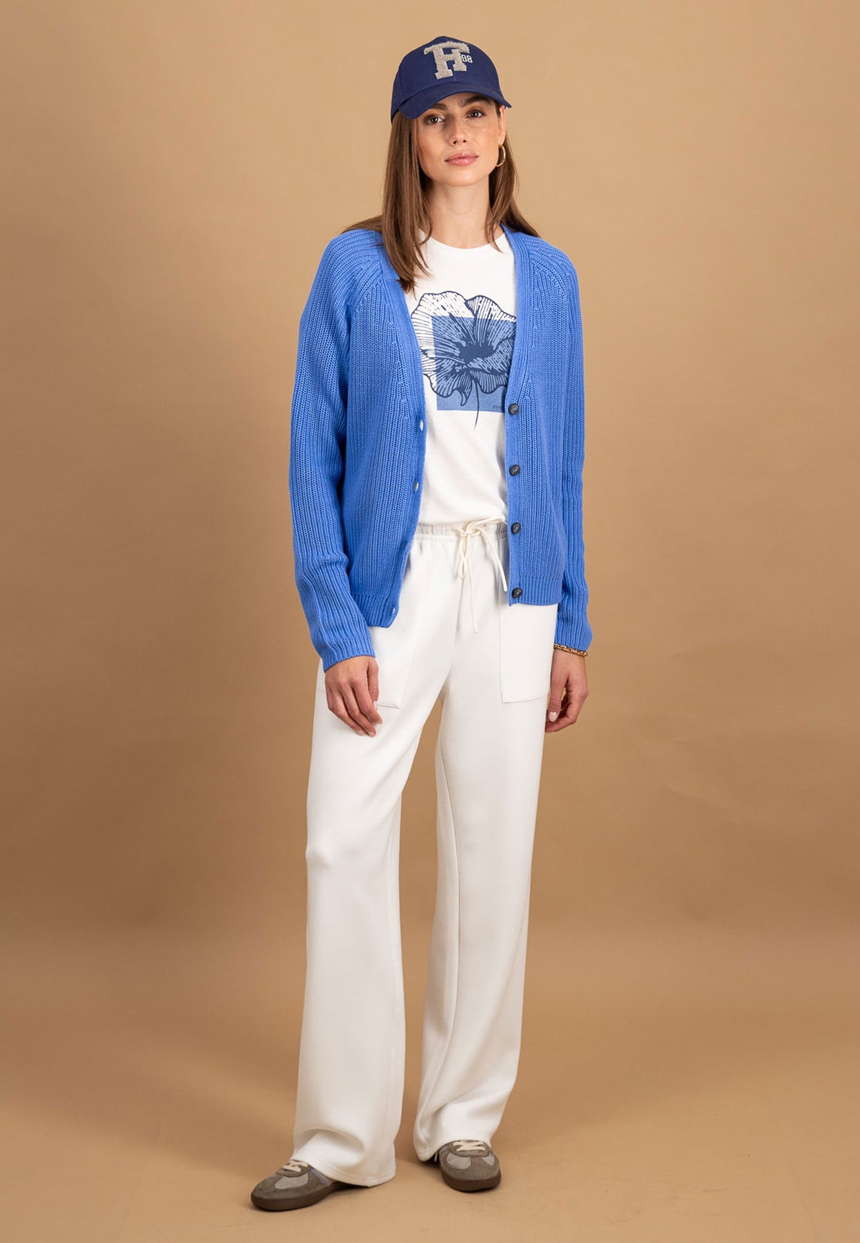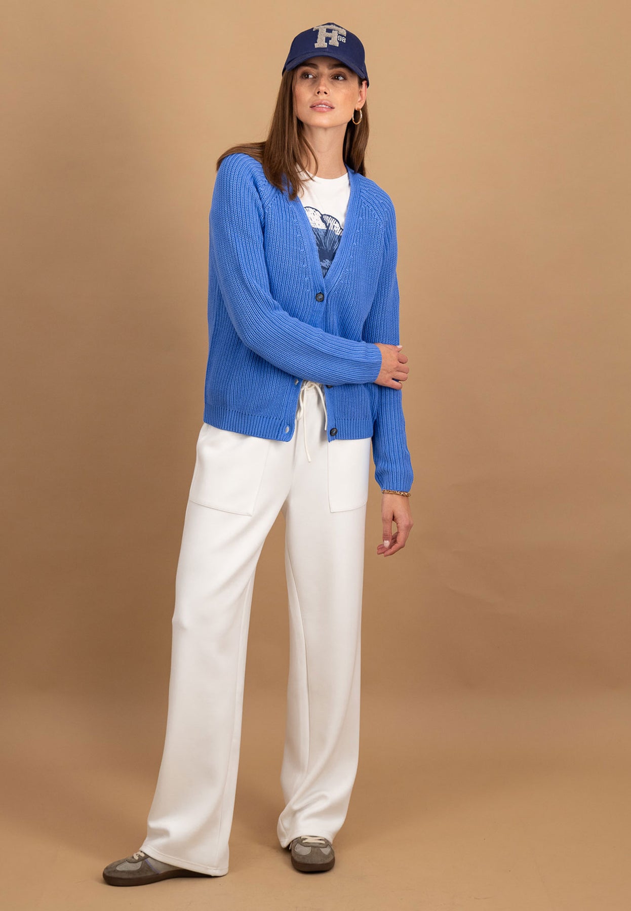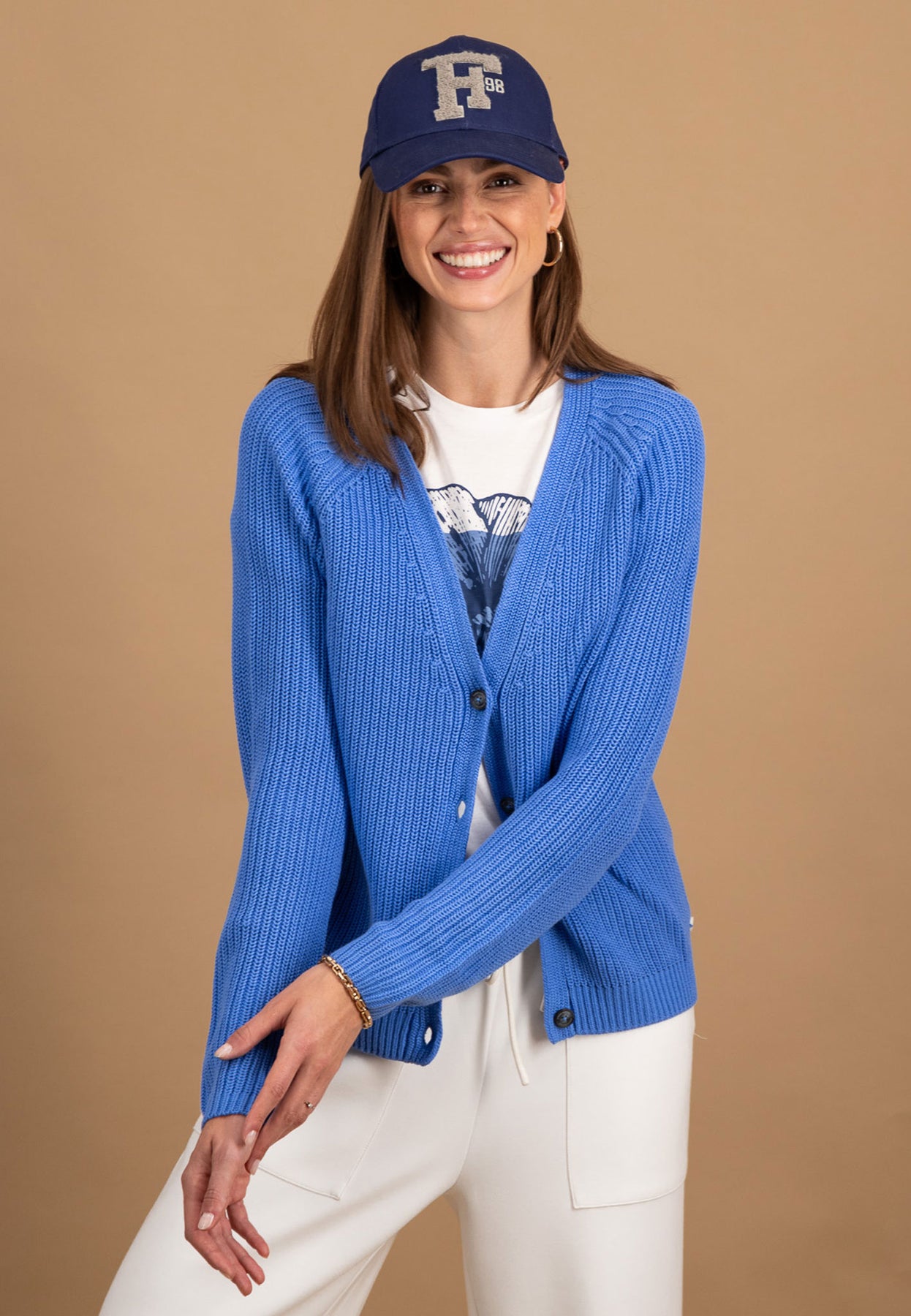 Die grobe Rippenstruktur und der tiefe V-Ausschnitt verleihen dieser Strickjacke eine lässige Note mit femininer Ausstrahlung.