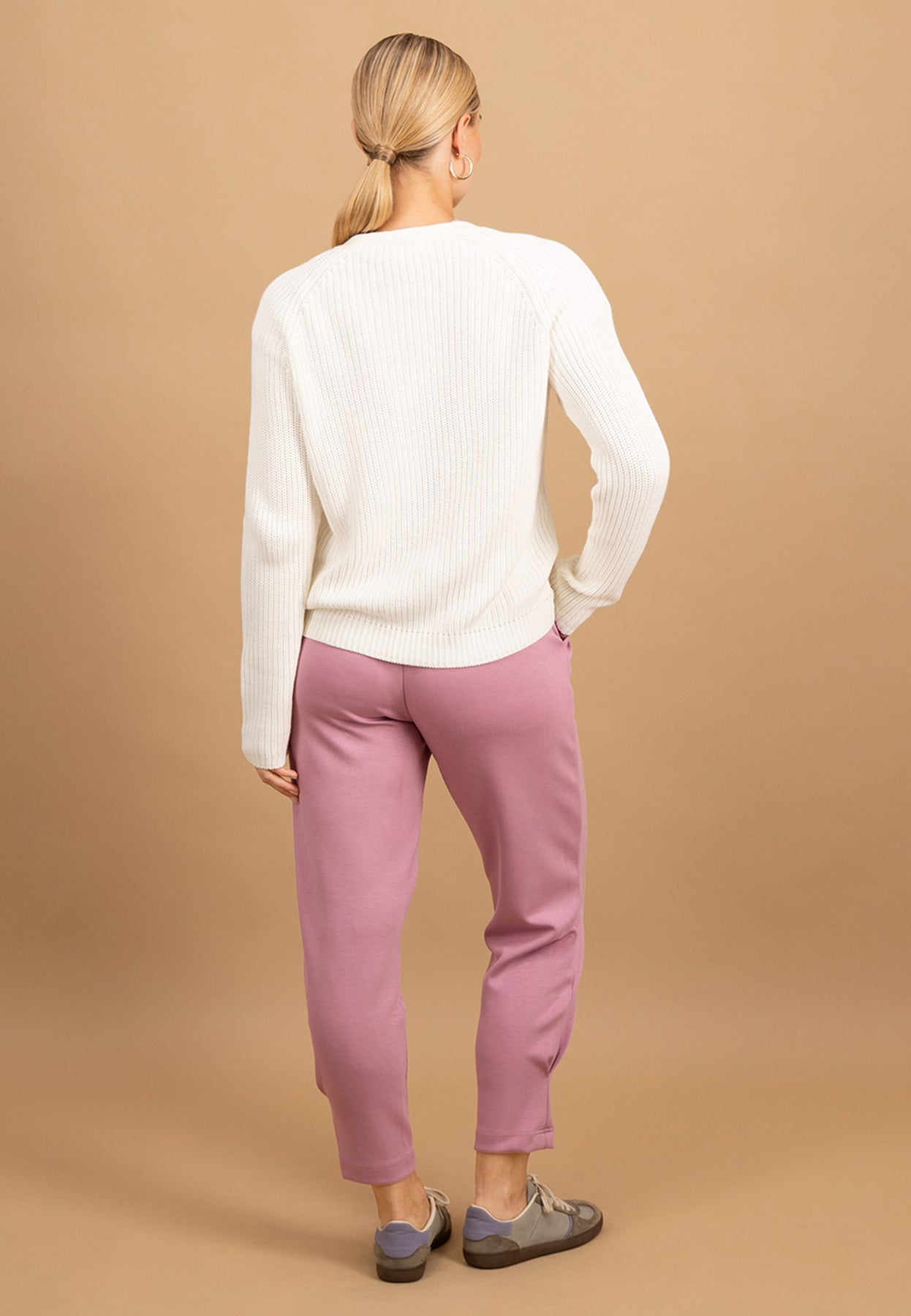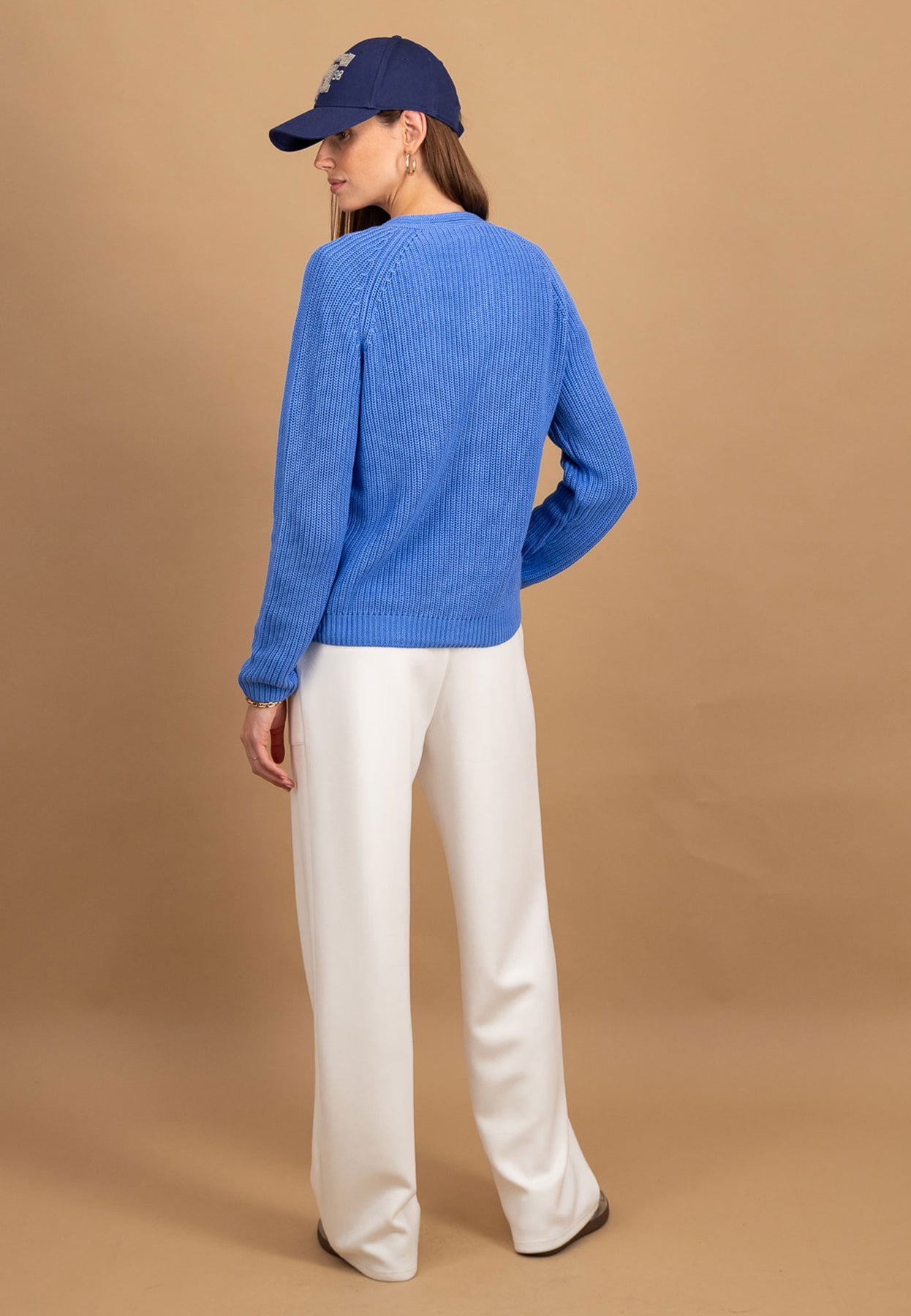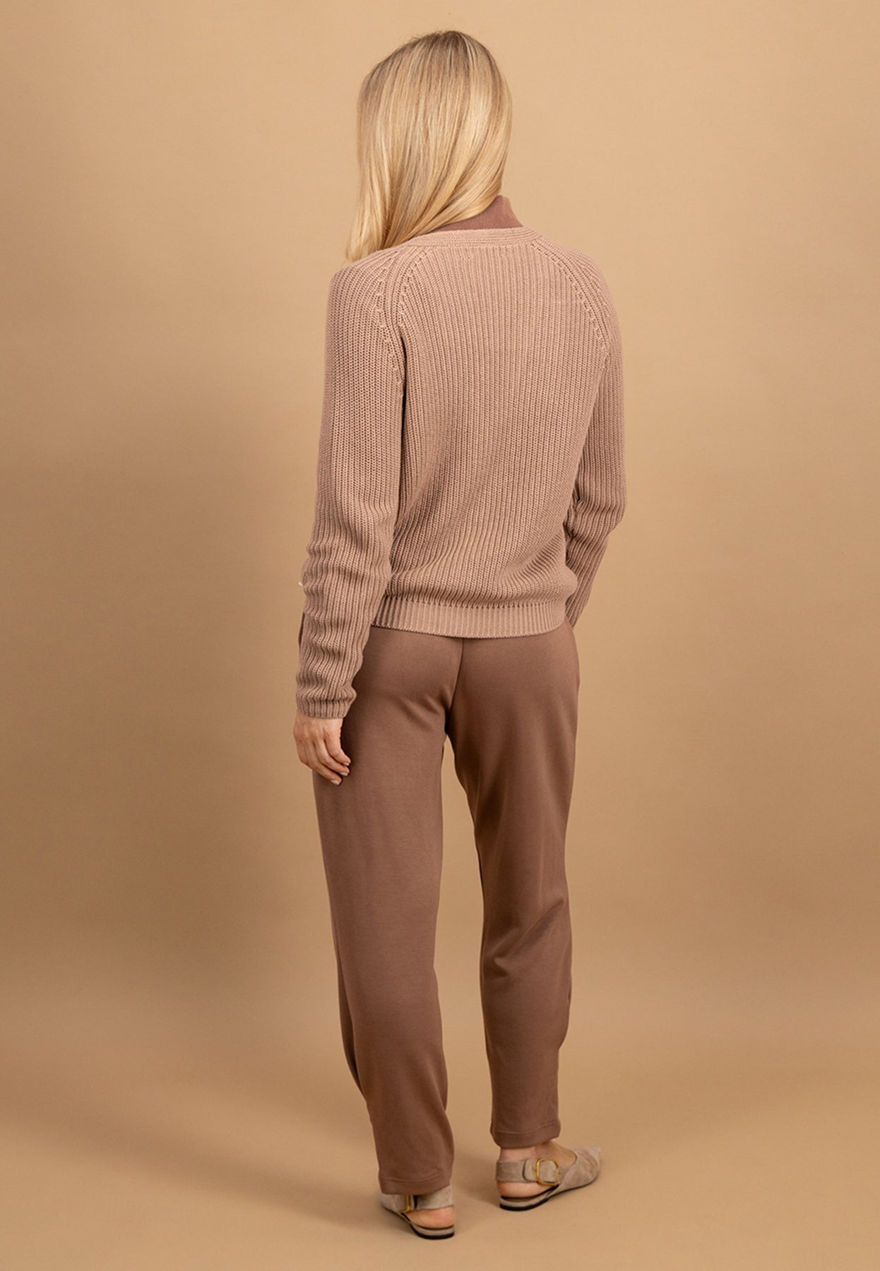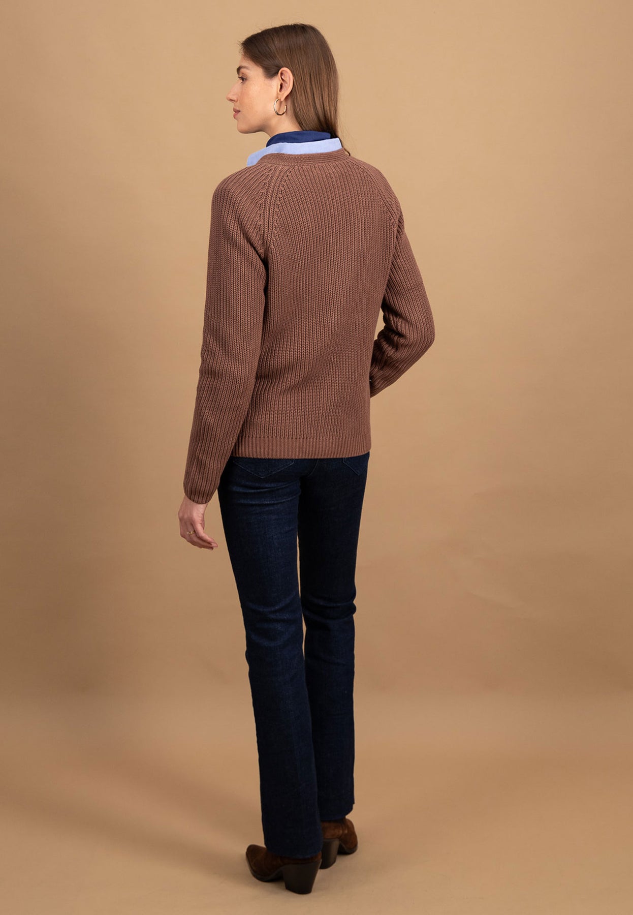 Die grobe Rippenstruktur und der tiefe V-Ausschnitt verleihen dieser Strickjacke eine lässige Note mit femininer Ausstrahlung.