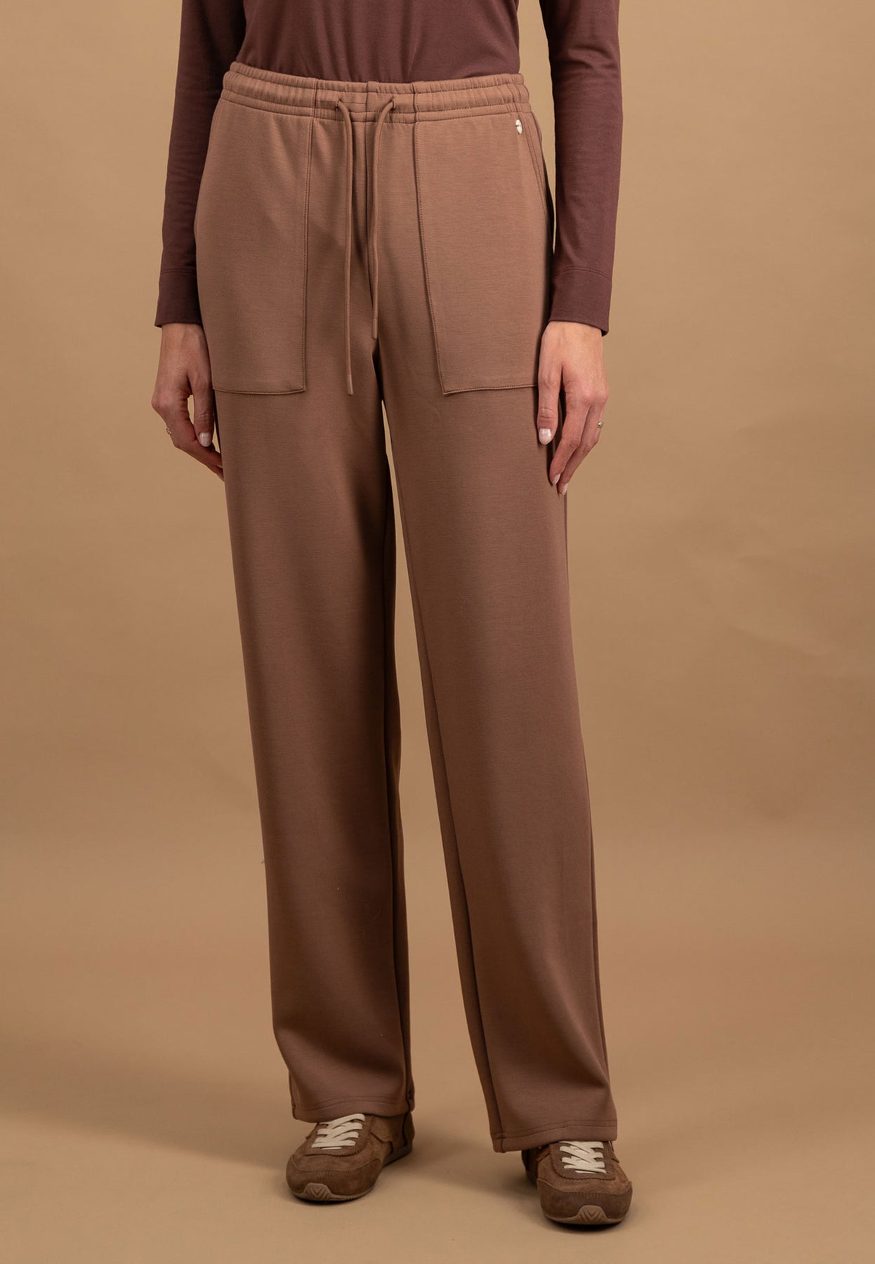Der softe Viskose-Mix mit Elasthan sorgt für ein besonders angenehmes Tragegefühl und optimale Bewegungsfreiheit. Der elastische Bund mit Tunnelzug sowie die aufgesetzten Taschen unterstreichen den funktionalen Look. Mit ihrem geraden Beinverlauf lässt sich die Hose vielseitig kombinieren – ob zu Sneakern, Shirts oder Strick.